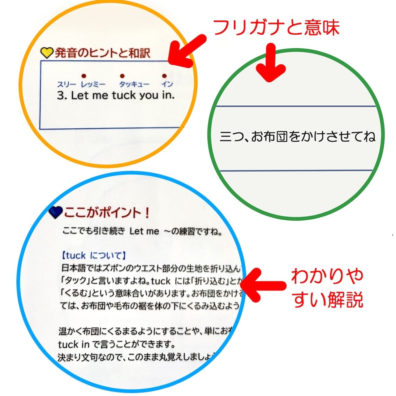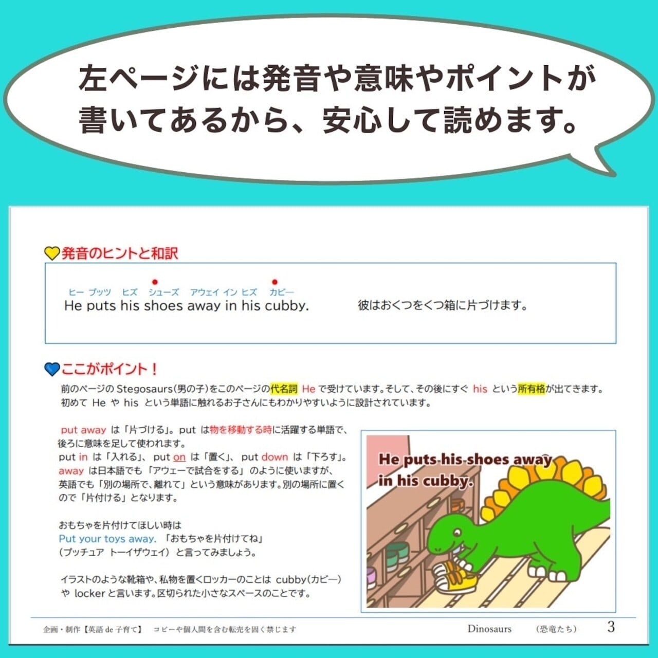 各ページ横には英語のフリガナと解説つき。誰でもすぐにお子さんに英語絵本を読んであげられます。